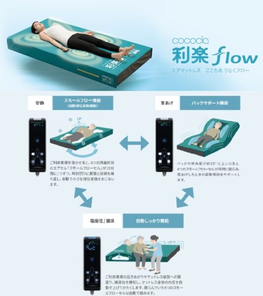 栄養状態の方など、褥瘡発症リスクの高い方への介護サービスの資質向上を目的に、自動体位変換機能付きのエア―マット「利楽」を導入しました。