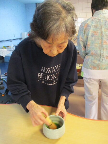 本日、4F誕生日会🎉では“野点”🍵を行いました。抹茶を利用者さんと点てて美味しくいただきました。いつもとは違ったお茶が出ることで、盛り上がりました。お茶菓子に芋ようかん🍡も提供されて、甘いものが好きな人にはたまらなかったようです😄 どらえ~もん