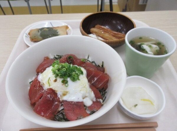 ユッケ丼のマグロはいつもお世話になっている魚屋さんに協力していただき、きれいなお刺身を納めていただきました🙏(ありがとうございます!)