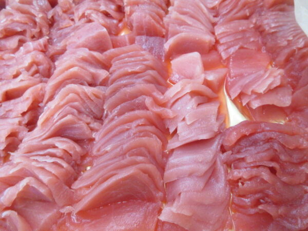 一枚一枚きれいに切り分けられたお刺身に特製のピリ辛タレを付けて、お好みで追いタレをしていただきます。