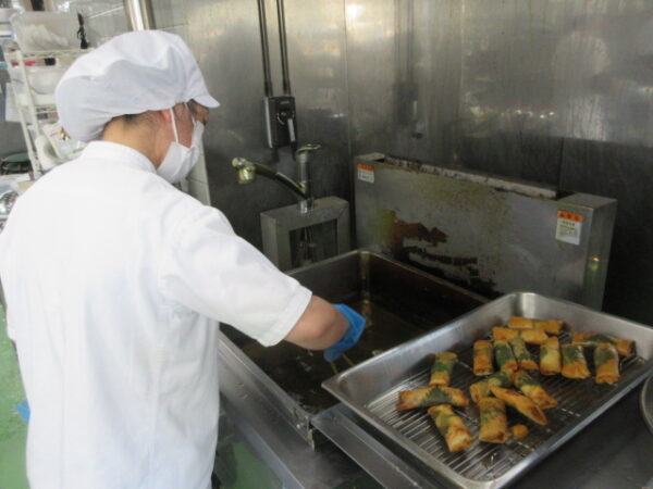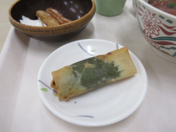 春巻きの中身は“ささみと梅と大葉”です。大葉は揚げたときにきれいに見えるように表に巻いていきます。