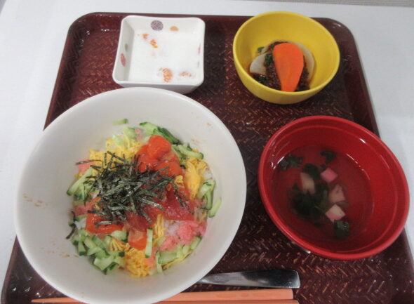 ちらし寿司・ふろふき大根そぼろ味噌かけ・フルーツ牛乳かん・すまし汁