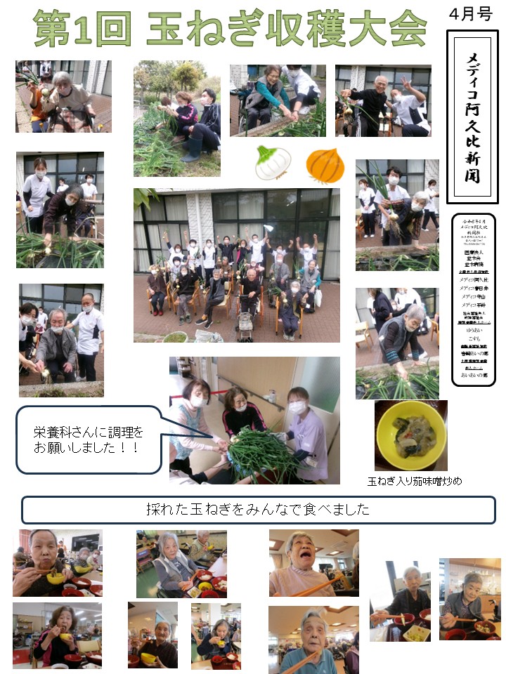 心地よい春風が吹く中、入所者のみなさんと一緒に大切に育ててきた「玉ねぎ」を収穫し、 調理師さんに「玉ねぎ入りの味噌炒め」にしてもらい、みなさんに食べてもらいました。 ヒーロー